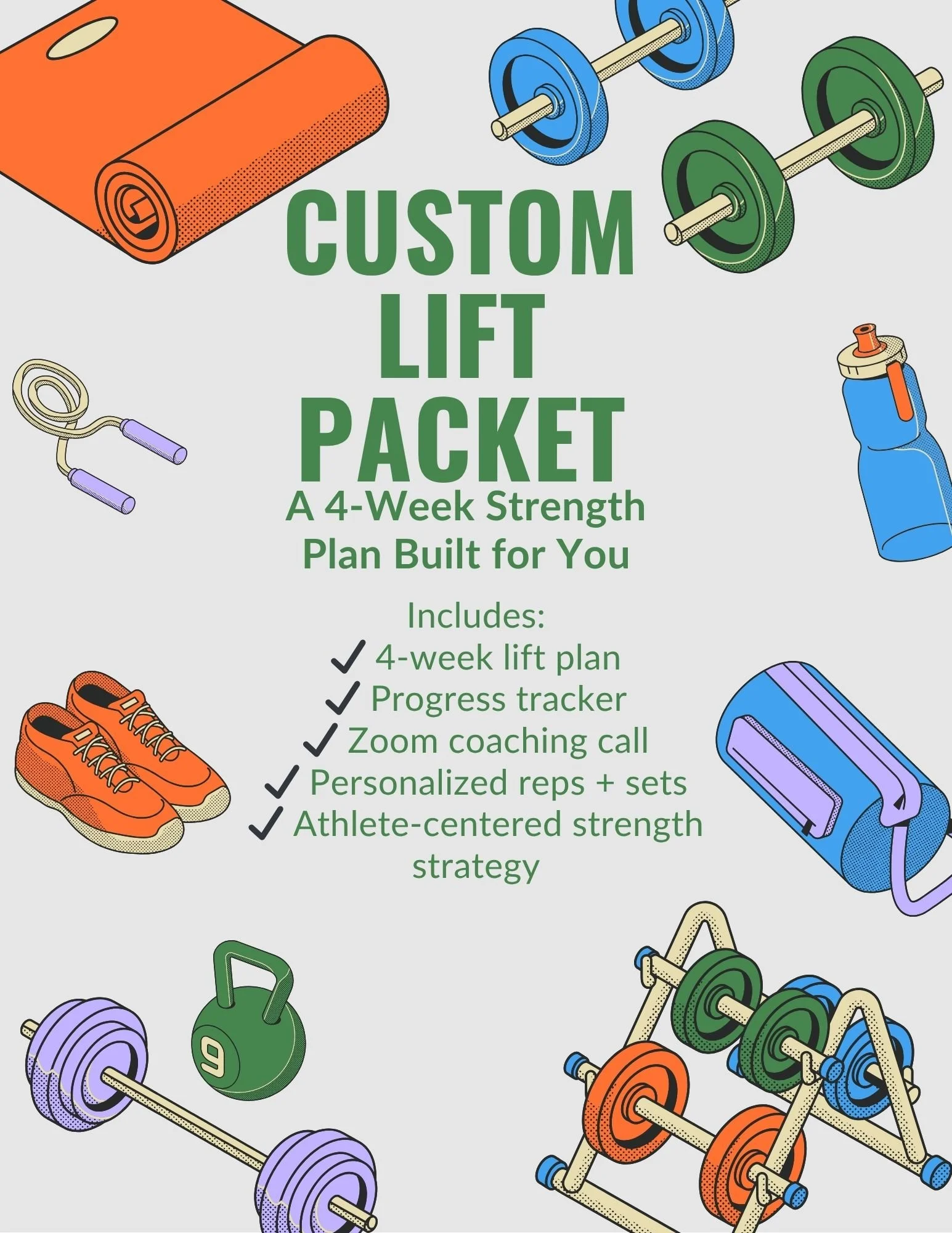 This is your custom strength plan designed specifically for YOU. Whether you’re in-season, off-season, or just looking to level up, this 4-week lift packet is tailored to your goals, position, training schedule, and equipment access.