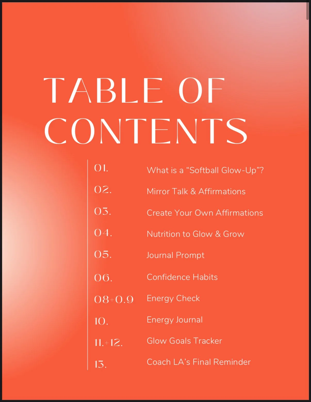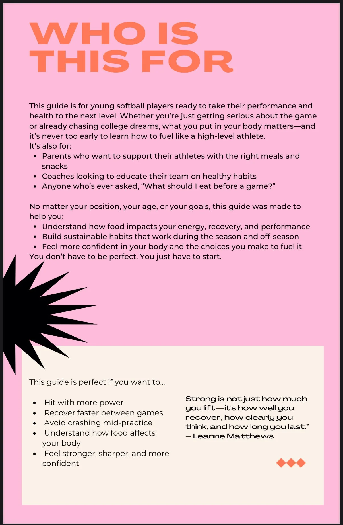 Store Custom Lift Packet $49.99 Add To Cart Added! COMING SOON! The Ultimate Recovery Guide for Softball Athletes $0.00 Coming Soon! Added! Pretty Tough: A Softball Girl’s Glow-Up $12.99 Add To Cart Added! Raising a Leader in Cleats: Preview (Free Download) $0.00 Add To Cart Added! Raising a Leader in Cleats $14.99 Add To Cart Added! Nutrition Softball Handbook $12.99 Add To Cart Added! Game Day Confidence Checklist & Worksheet (Free Download) $0.00 Add to Cart Added! Softball Learning Style Quiz $1.49 Add to Cart Added!